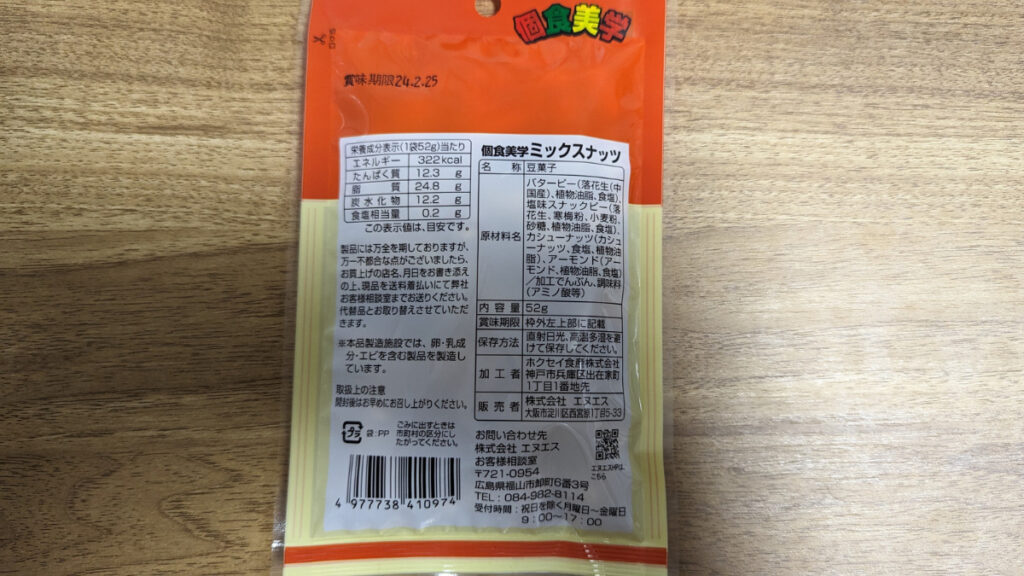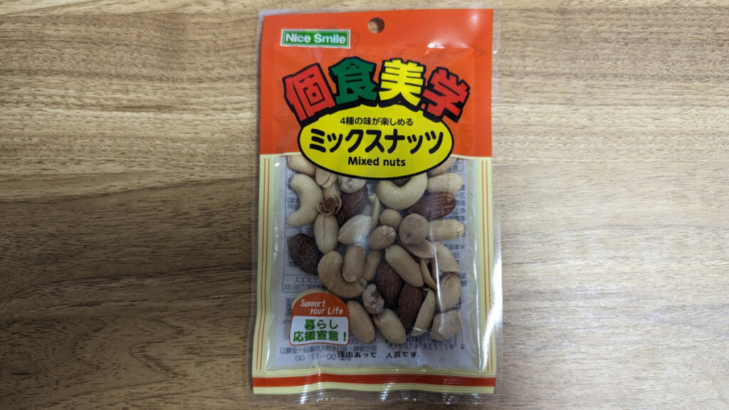 写真のミックスナッツは100円商品ですが、これでも1袋で322kcalを摂取できます。